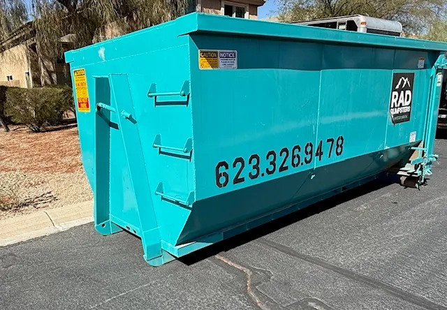 Trash and waste build up fast and the headache of loading up a pickup or trailer and taking the time to drive to the dump can be overwhelming. Rad Dumpsters handles the hassle of hauling waste for you. We drop the dumpster off at your home or job site and you fill it up. We then haul it away. Its that simple. Saving you hours so you can focus on whats important. Whether you are a professional contractor looking to dump material or a home owner clearing out a yard or garage we got you covered. Our 20 yard dumpster can handle roughly 150 trash bags or 6 pickup loads. That is huge savings compared to round trips to the landfill and time involved. We offer short term rentals and can work out terms that meet you projects goals and timeline. Our rates are competitive and we can work with options that suit your needs. Secure a dumpster rental HERE or contact 623-326-9478